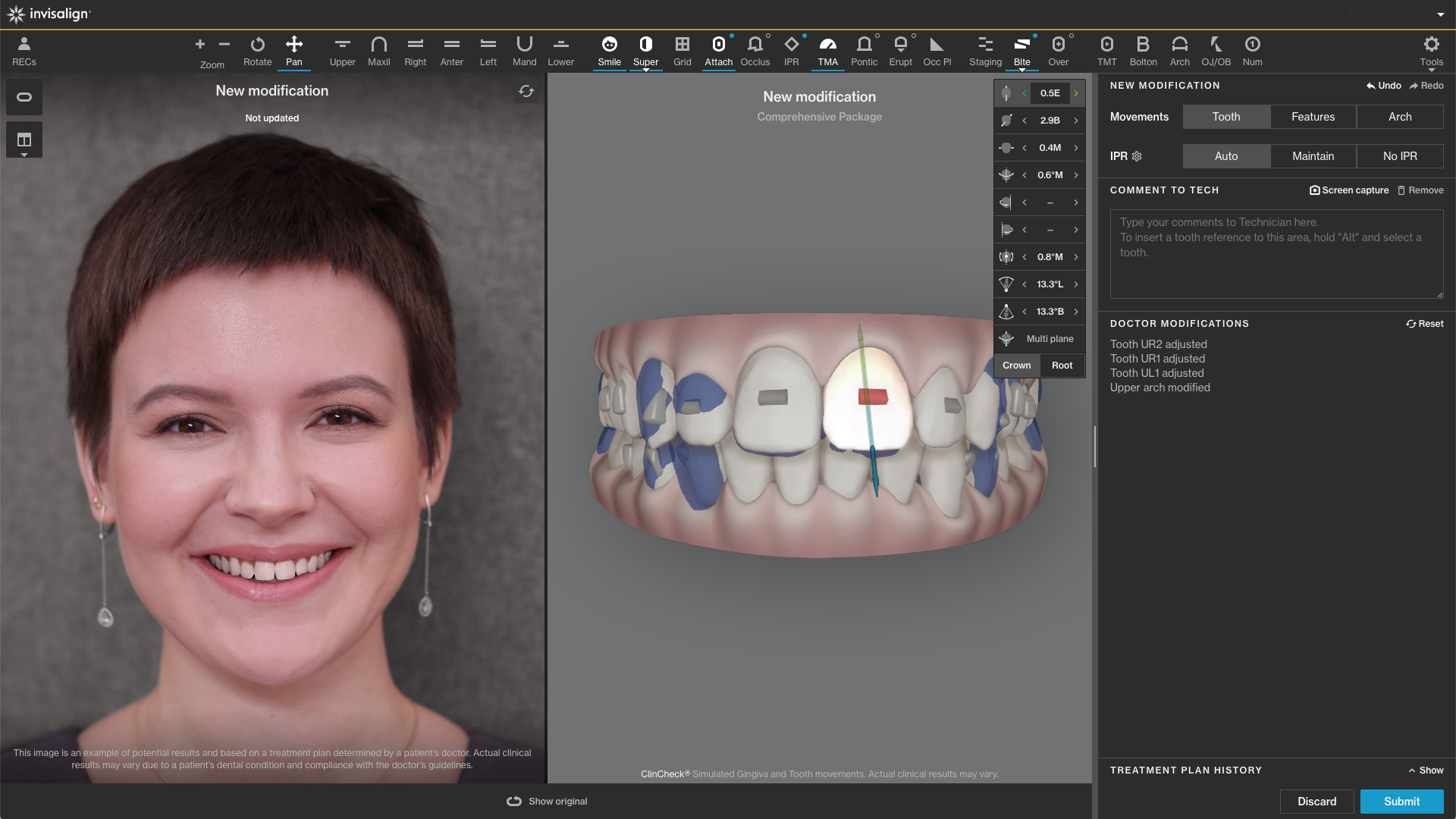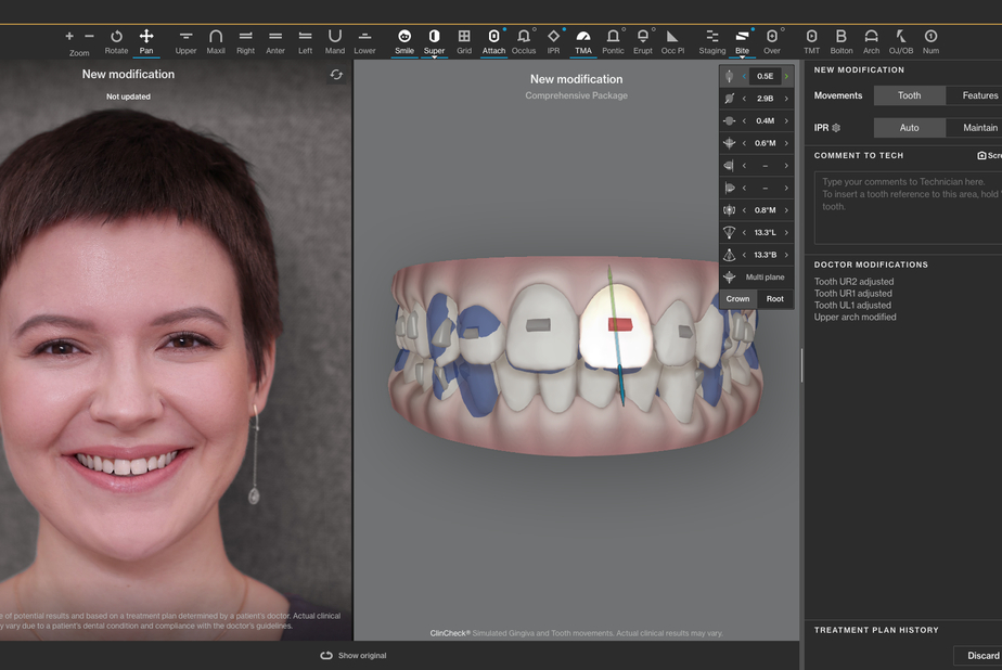 - I Controlli 3D del sistema Go Plus con un'interfaccia visiva 3D migliorata per aiutare i provider a personalizzare i loro piani di trattamento e a rivedere istantaneamente le modifiche sul Clincheck e su In-Face, che permette la simulazione del piano sul viso del paziente, per migliorare l'efficienza e ridurre al minimo i tempi di pianificazione del trattamento.